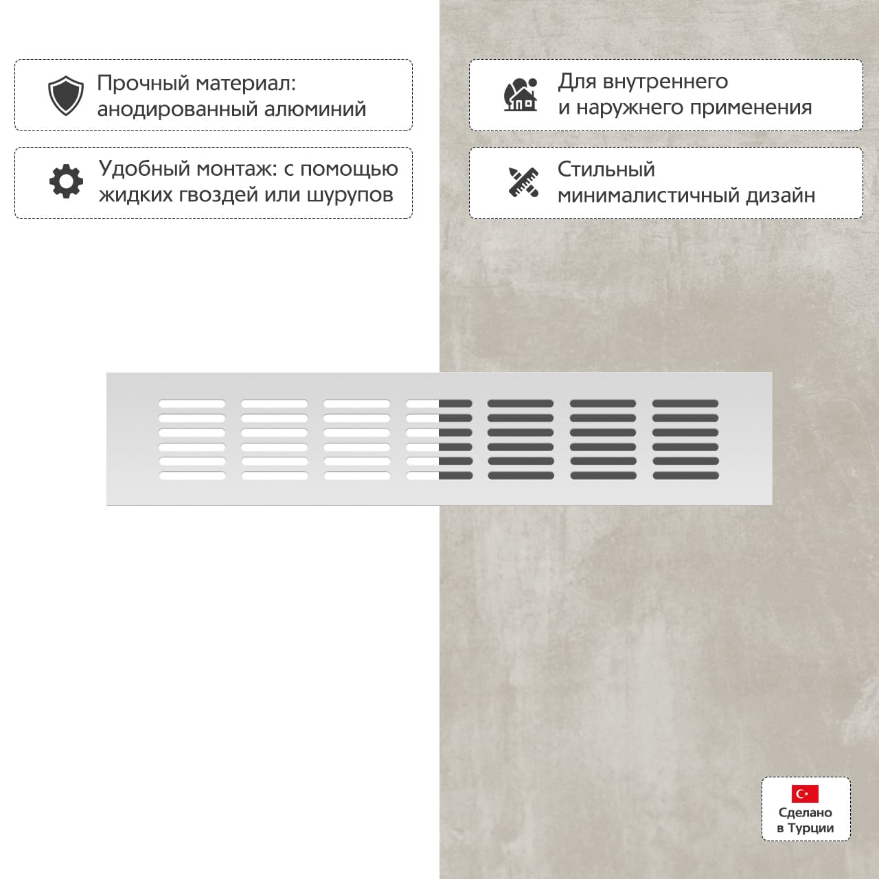 Прямоугольная вентиляционная решетка изготовлена из анодированного алюминия.
