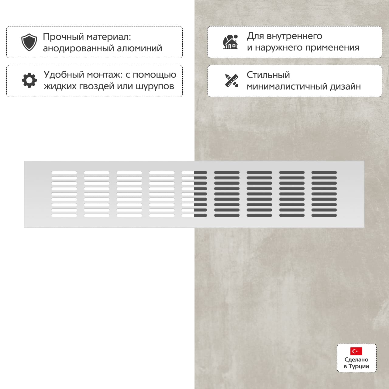 Прямоугольная вентиляционная решетка изготовлена из анодированного алюминия.