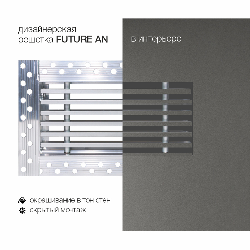 FUTURE-15 - дизайнерская решетка для скрытого монтажа от известной итальянской компании BROFER. Разработана специально для тех, кто выбирает стиль и качество в оформлении интерьера и продумывает каждую деталь. Используется в системах вентиляции и кондиционирования как конечный декоративный элемент для подачи свежего или удаления загрязненного воздуха.