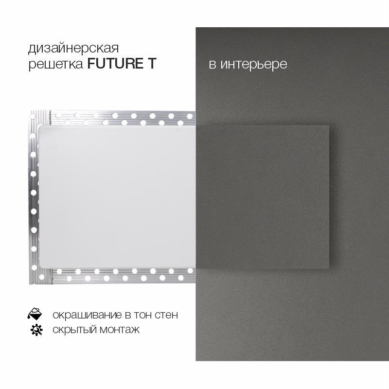 FUTURE-T - дизайнерская решетка для скрытого монтажа от известной итальянской компании BROFER. Разработана специально для тех, кто выбирает стиль и качество в оформлении интерьера и продумывает каждую деталь. Используется в системах вентиляции и кондиционирования как конечный декоративный элемент для подачи свежего или удаления загрязненного воздуха.