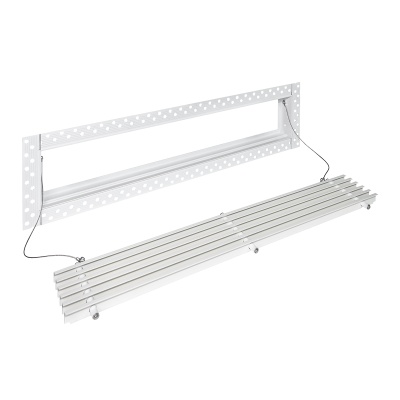 Данная решетка подходит для монтажа на любую поверхность под финишную отделку. Рама оснащена «полкой» 1,9 мм и рифлеными краями для большей адгезии финишного материала – шпатлевки, цемента. Решетка имеет съемную центральную часть с декоративным экраном. Она крепится к корпусу прочными металлическими тросиками, легко снимается для очистки и удобного обслуживания.